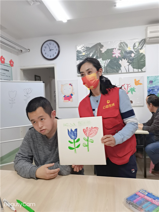 志愿者与“孩子们”分为2人一组,共同完成一项任务,那就是跟着实习老师学习画两朵花,并且送给最想送的那个人。