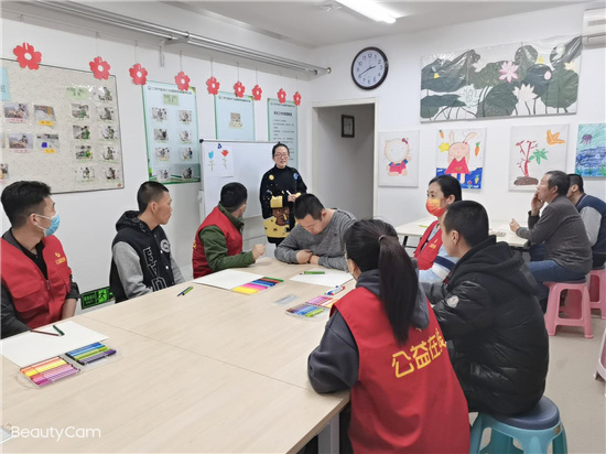 志愿者和孩子们一起拿起彩笔,体验色彩与那份童心童画。在志愿者们一对一的耐心引导下,“孩子们”都画出了自己心里的两朵花。
