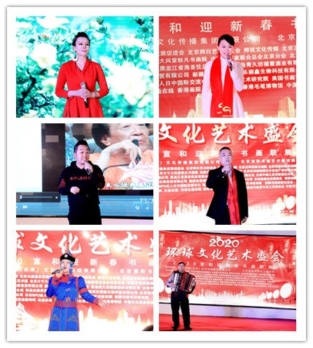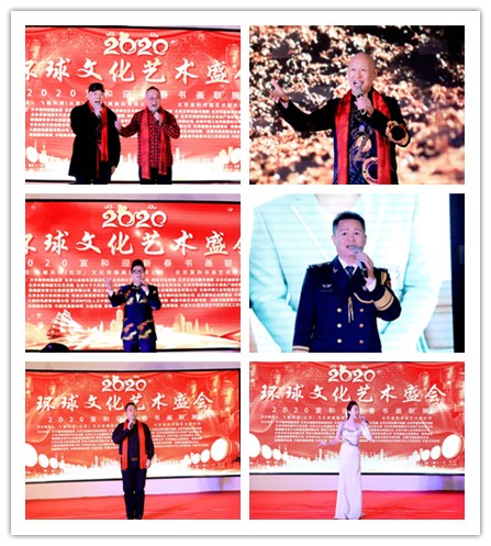 晚会开始后,著名男高音歌唱家西部歌王张红旗、单田芳关门弟子杨永恩、《星光大道》嘉宾评委塔拉吉斯、《星光大道》歌手:小保安 张宏争、青年歌手盛中华、青年歌手肖文莉、民族歌手肖国鑫、青年歌手赵泽、艺术家柴京津分别以演唱歌曲、相声、乐器等多种形式为大家带来精彩节目,并赢得阵阵掌声与好评。艺术家杨丙臣、周曦、武凤金、王国增、赵福等艺术家为本次活动赠送书了法作品以示祝贺。可以说整场活动在充满浓浓节日气氛的同时,也为2020新年的到来增添了别样的文化喜庆色彩。