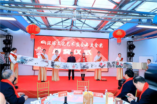 单玉志向陈爱莲(秘书代领)颁发环球文化艺术盛会年度金奖