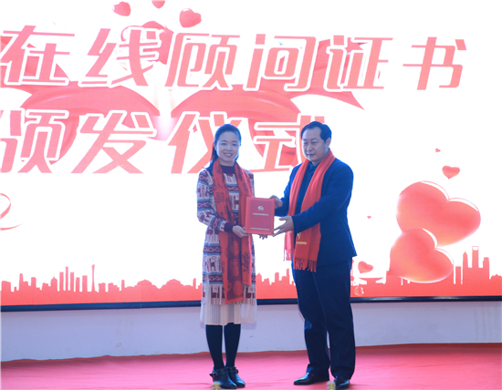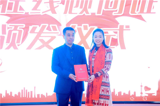 许顺喜向陈爱莲(秘书代领)颁发公益在线名誉站长证书