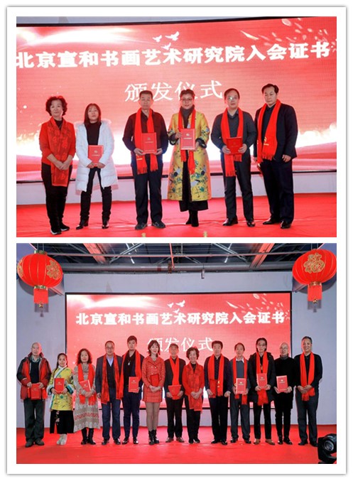 与此同时,宣和书画艺术研究院顾问白雁、雍刚、王大川,张政、谭建新、张业军,为 陈泓宇、胡节、陈立英、爱新觉罗·焘云、爱新觉罗·启年、覃大松、傅泊、孟昭和、李庆新、许美祥、杨羽莎、田一宏、杨力争、李文进等新加入宣和艺术院的成员颁发证书。